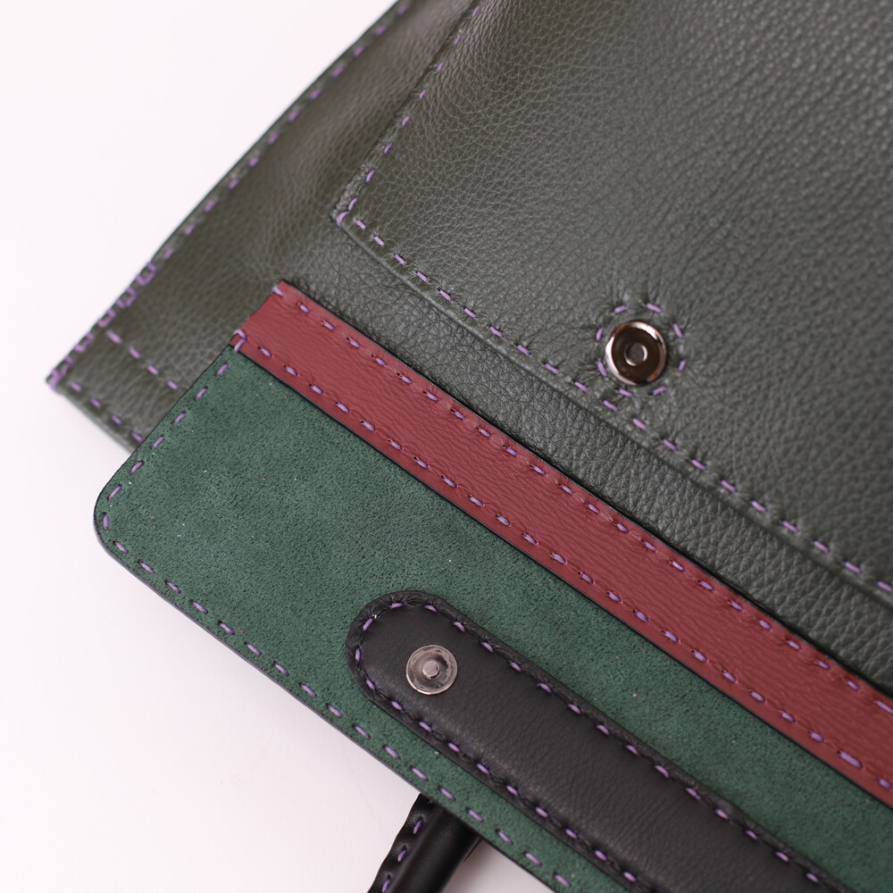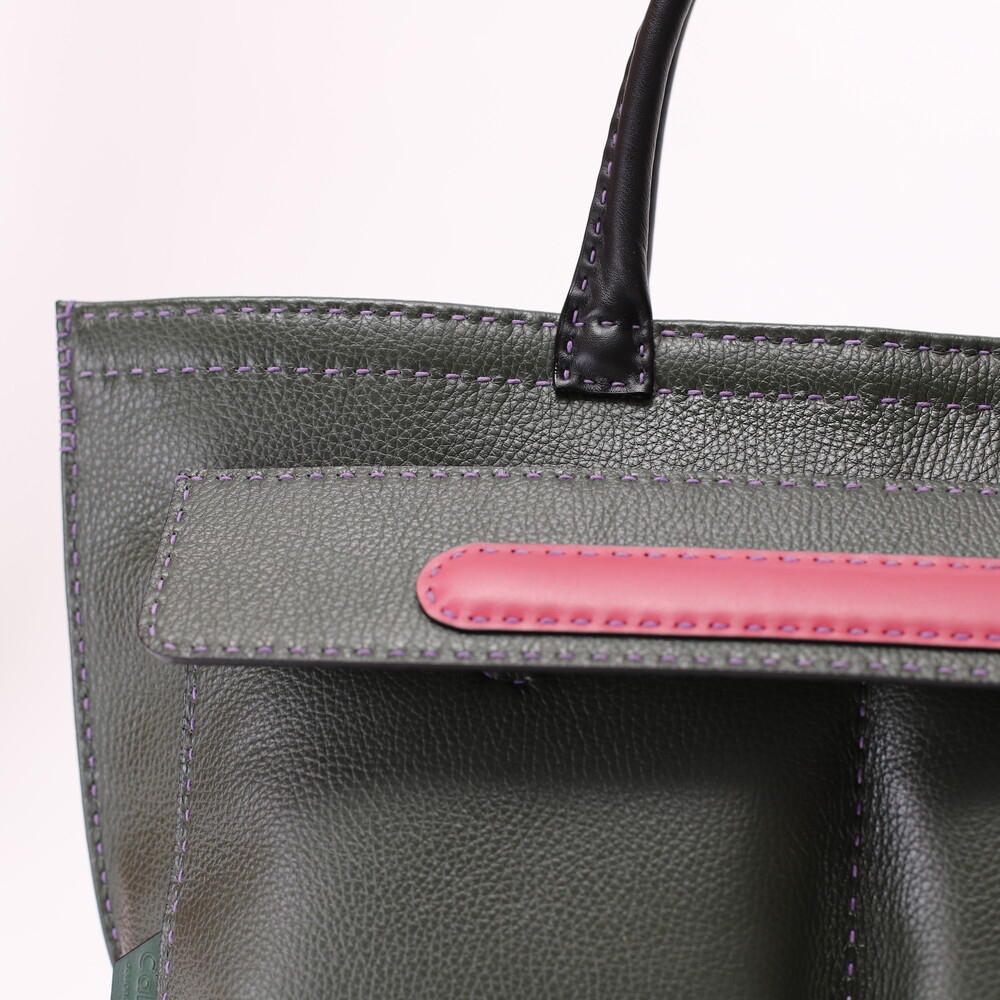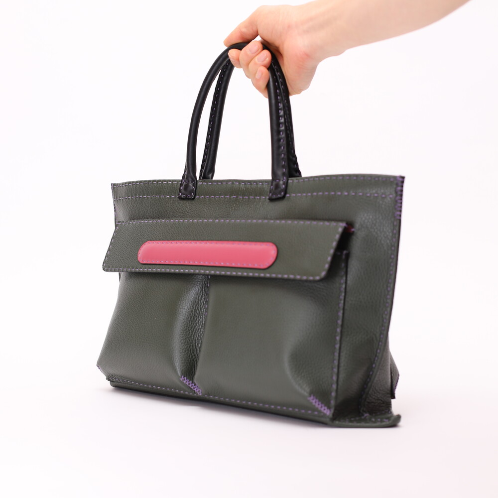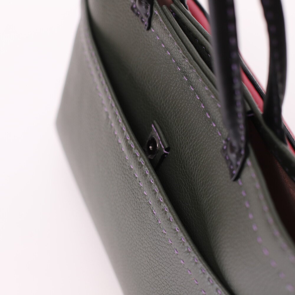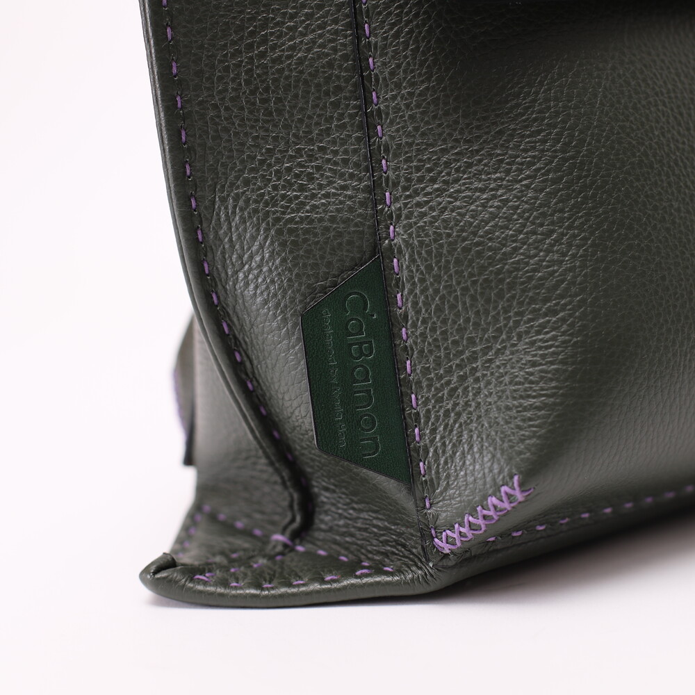 . 카키 가죽에 보라색 바늘땀이 포인트